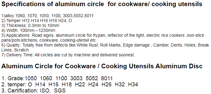 Aluminum circles for cooking utensils, aka cookware aluminum circle, aluminum circles for cookware, is a kind of aluminum circle that is generally for sale. The material of Haomei cookware aluminum circles can be 1060 aluminum circle, 1070, 1050 aluminum circle, 1100 aluminum circle, 3003 aluminum circle, 5052, 8011, and the tempers of it can be various in the following category like H12 H14 H16 H18 H24, O. And here are the parameters of cookware aluminum circles.